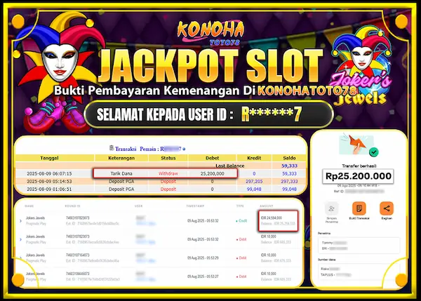 Jakarta, 10 August 2025 — Siapa bilang jackpot besar cuma cerita dari mulut ke mulut? Kali ini ada bukti jackpot Jokers Jewels yang nyata, bukan sekadar klaim kosong. Seorang member di platform Konohatoto78 sukses membawa pulang cuan sebesar Rp25,2 juta hanya dari satu sesi game di slot Jokers Jewels. Menariknya, kemenangan ini datang dari modal yang relatif terjangkau, membuktikan bahwa peluang selalu ada selama strategi dan timing bermain nya tepat. Bukti jackpot Jokers Jewels ini memang menginspirasi banyak orang untuk mencoba peruntungan mereka.