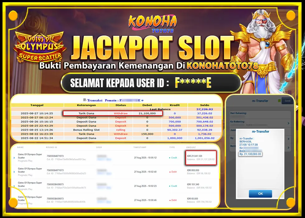 Jakarta, 28 August 2025 — Lo pernah ngerasain serunya dapet jackpot di game slot? Kalau belum, mungkin cerita satu ini bisa jadi pemicu semangat lo buat nyobain. Di tengah hype dunia slot online, kali ini datang kabar dari salah satu member aktif Konohatoto78 yang berhasil bawa pulang jackpot super scatter di Gates of Olympus senilai Rp21 juta. Bukan hoax, ini adalah bukti kemenangan situs slot gacor Konohatoto78 yang real dan bisa lo jadiin inspirasi.