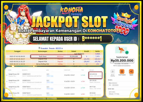 Jakarta, 4 July 2025 — Ada satu hal yang paling dicari para pemain slot: bukti pembayaran yang beneran cair. Bukan sekedar cuap-cuap atau screenshot editan, tapi transfer asli, real, masuk rekening, nominal nya jelas. Nah, kali ini Konohatoto78 bawa bukti yang gak bisa di bantah—jackpot starlight princess 1000 tembus Rp35,2 jutadan dibayar full, tanpa potongan, tanpa janji kosong. Bukti pembayaran slot online memang tak terbantahkan.