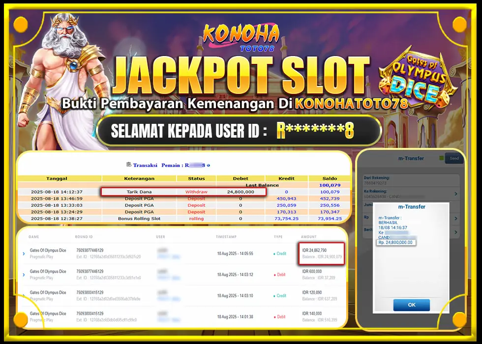 Jakarta, 19 August 2025 — Lo pernah ngerasain gimana rasanya dapet kejutan gede dari game yang lo mainin tiap hari? Nah, salah satu member setia Konohatoto78 baru aja ngerasain hal yang bikin iri banyak pemain lainnya. Dalam game slot legendaris Gates of Olympus Dice, dia berhasil ngeklaim jackpot gede senilai Rp24,8 juta! Gak pake banyak drama, cuma modal feeling dan strategi main yang pas, hadiahnya langsung nyangkut!