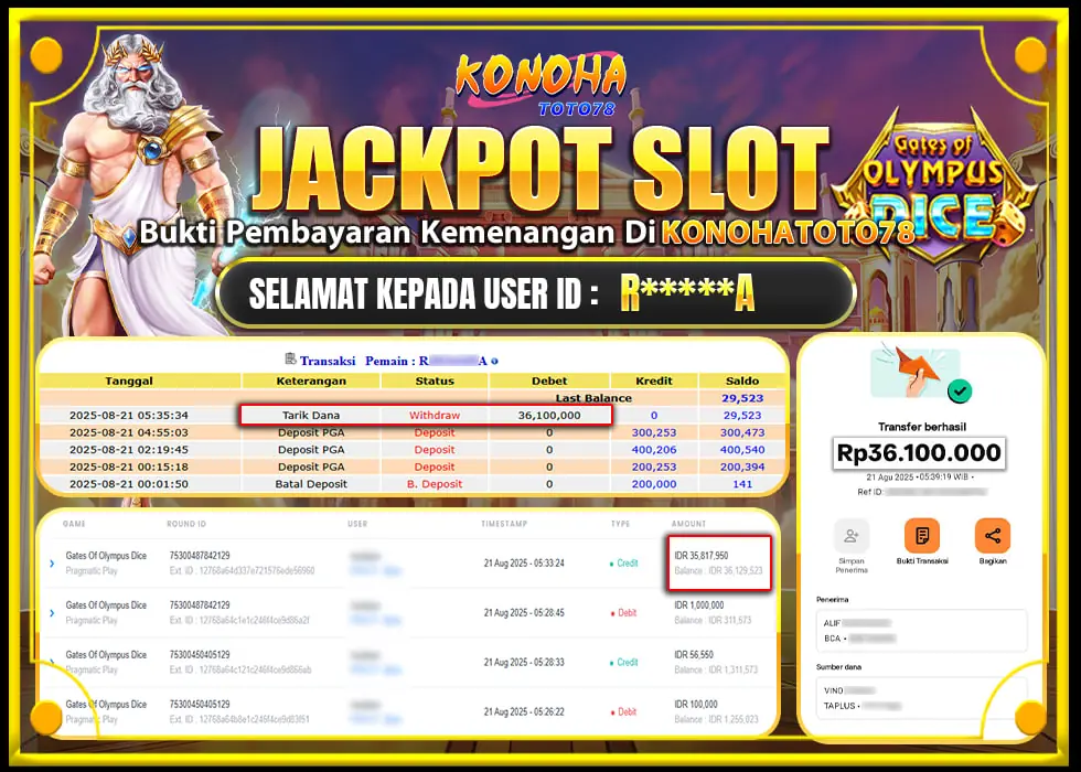 Yang bikin momen ini makin heboh adalah karena bukti transfer jackpot Olympus Dice beneran udah tersebar di komunitas slot online. Bukan cuma sekedar cerita menang, tapi ada bukti real kalau player Konohatoto78 berhasil cairin Rp36.100.000 langsung ke rekening pribadi.