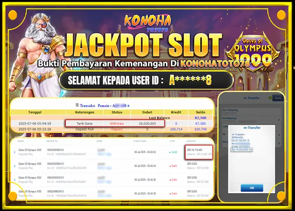 Jakarta, 7 July 2025 — Nggak semua orang percaya sama yang namanya hoki, apalagi kalau udah ngomongin dunia perslotan. Tapi kejadian satu ini bisa bikin lo mikir dua kali. Pengalaman mengesankan ini melibatkan Jackpot Slot Online Terbesar di Konohatoto78. Ada yang berhasil panen Rp19 juta cuma dari satu spin di Konohatoto78, dan slot yang dipake pun bukan yang asing—Gates of Olympus 1000. Bukan screenshot editan, bukan juga cerita karangan. Ini bukti nyata yang terekam jelas.
