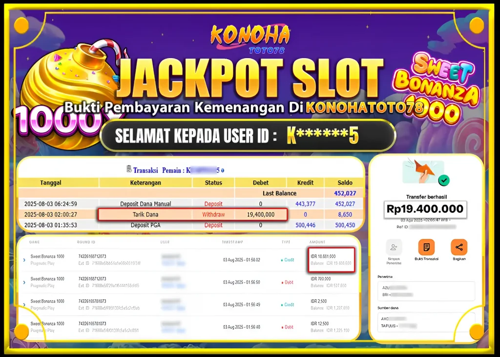 Banyak situs janji manis doang, tapi pas lo menang besar, baru deh muncul banyak alasan. Di Konohatoto78, lo gak bakal ketemu drama begitu. Udah ada beberapa pemain yang buktikan sendiri dapet jackpot Sweet Bonanza 1000 dan langsung di kasih cair—full tanpa potongan aneh-aneh.