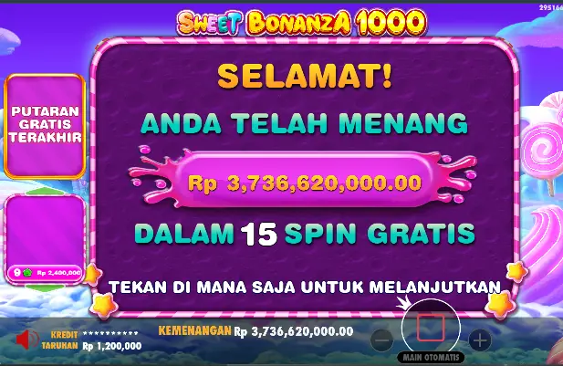 Jakarta, 22 Juli 2025 — Siapa sangka, di tengah persaingan panas dunia slot online, muncul satu momen yang bikin pemain dan penonton sama-sama melongo. Tanpa banyak sorotan, satu akun di Konohatoto78 sukses membuktikan bahwa keberuntungan bukan cuma mitos—Jackpot Sweet Bonanza x1000 resmi tembus 3,7 miliar di Kemenangan Sweet Bonanza 1000! Bukan angka kecil, bro. Ini bukan kemenangan biasa. Ini adalah pencapaian yang layak masuk catatan paling mencolok di tahun ini.