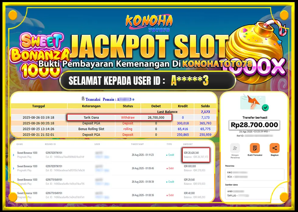 Jakarta, 27 August 2025 — Lo pernah ngebayangin menang puluhan juta cuma dari satu kali putaran game slot? Nah, kejadian ini beneran nyata dan baru aja dialamin sama salah satu player Konohatoto78. Di game Sweet Bonanza 1000, dia berhasil ngeklaim jackpot fantastis sebesar Rp28.700.000! Yang bikin makin keren, proses pencairan hadiahnya cepet banget — Konohatoto78 pembayaran lunas tanpa drama, tanpa pending.