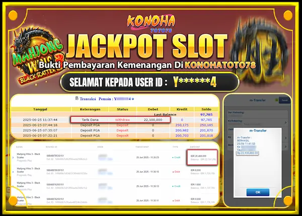 Jakarta, 26 Juni 2025 — Hey, sobat slotters! beberapa hari terakhir, satu bukti pembayaran dari Konohatoto78 Scatter Hitam, slot lagi bikin rame di kalangan pemain. Bukan isapan jempol, nominalnya tembus Rp22.100.000 cuma dari hasil jackpot Mahjong Wins 3 Black Scatter. Yang bikin makin menarik, bukti transfer nya udah mendarat mulus ke rekening pemenang. Nggak banyak omong, langsung cair.