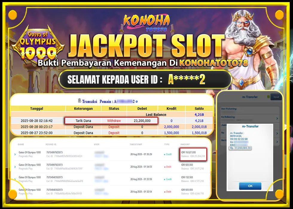 Jakarta, 29 August 2025 — Lo pasti udah nggak asing lagi sama game slot Gates of Olympus kan? Nah, di artikel ini gue bakal bahas gimana salah satu member situs slot gacor Konohatoto78 berhasil mendapatkan jackpot Rp23.200.000 cuma pake pola sakti Olympus 1000. Nggak gimmick—semua real dan terbukti cair.