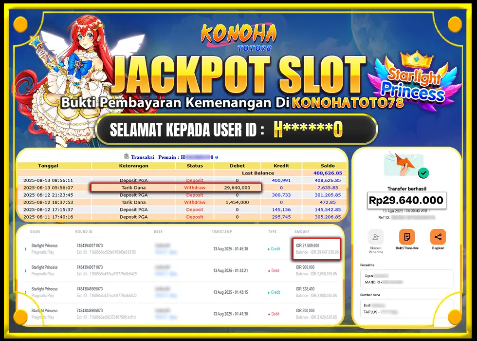 Jakarta, 14 August 2025 — Kalau lo pikir menang puluhan juta di game slot cuma mimpi, mungkin lo belum liat bukti yang satu ini. Seorang pemain di Konohatoto78 baru aja ngegas di slot online starlight princess 1000 dan berhasil bawa pulang jepe Rp 29,6 juta hanya dari sekali sesi main. Bukan modal gede, bukan hoki kebetulan, tapi hasil dari main di tempat yang memang terkenal gacor.