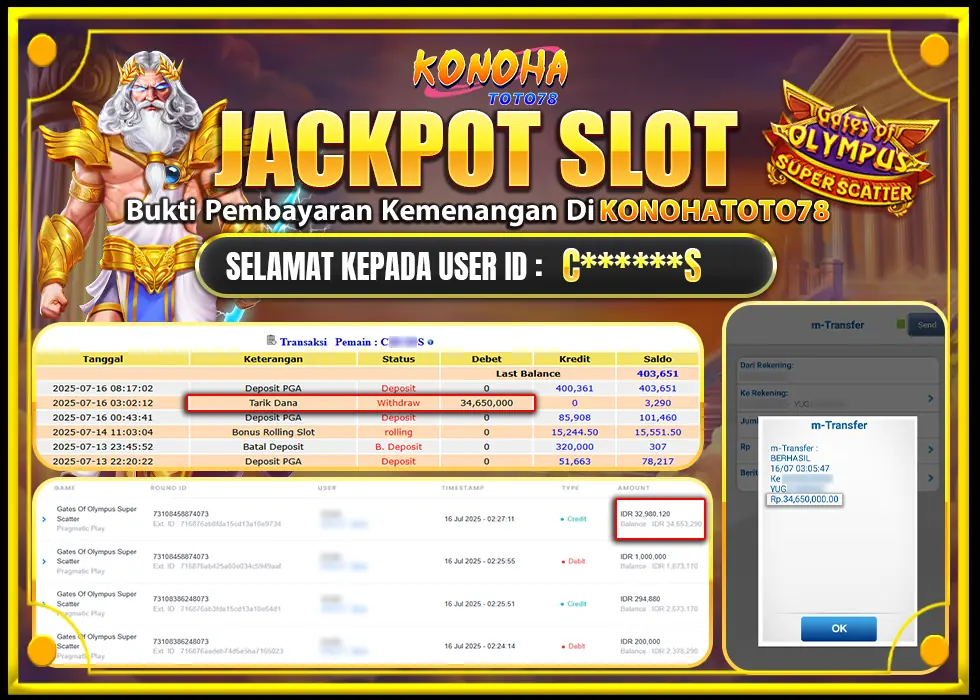 Yang namanya menang besar pasti banyak yang skeptis. Tapi bukti gak bisa bohong. Transfer masuk Rp34,6 juta dari Konohatoto78 langsung ke rekening si pemenang. Screenshot udah ada, testimoni pun jelas—bukan akun fake, bukan rekayasa. Slot Online Terpercaya seperti Konohatoto78 ini yang bikin nama Konohatoto78 makin solid di mata para slot hunter sejati. Semua ini merupakan bukti menakjubkan menang slot dengan kesempatan yang menguntungkan.