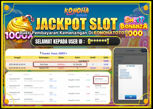 Jakarta, 9 August 2025 — Bagi para pecinta slot online, Sweet Bonanza 1000 di Konohatoto78 bukan lagi sekadar game hiburan—ini adalah arena berburu cuan besar. Ini bisa bikin saldo meledak! Bagi yang ingin trik gacor Sweet Bonanza 1000, dengan RTP tinggi, fitur free spin melimpah, dan simbol pengganda yang bisa mencapai ribuan kali lipat, banyak pemain sukses dapat jackpot. Salah satunya, jackpot senilai Rp32,7 juta yang baru ini di raih oleh member setia Konohatoto78.