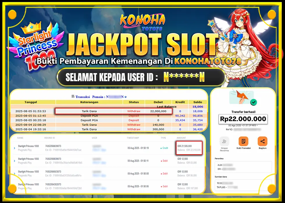 Jakarta, 5 August 2025 — Lo pernah nggak sih ngerasa hoki banget pas main slot? Gue juga awalnya nggak nyangka bisa nyentuh jackpot sampai Rp22 juta dari slot Starlight Princess 1000 di Konohatoto78. Awalnya iseng-iseng, modal cuma 90 ribu. Tapi karena penasaran dan ngulik cara mainnya, akhirnya ketemu trik slot Starlight Princess 1000 yang ternyata bisa bantu peluang menang gue.